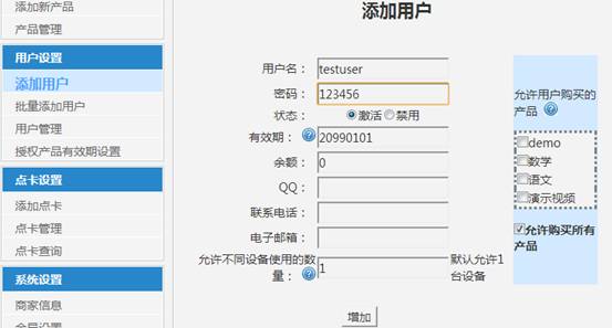 添加用戶(用戶在安卓手機(jī)上運(yùn)行加密視頻前需要輸入該用戶帳號(hào), 驗(yàn)證通過后才能播放)