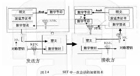 列出了一次安全交易會話涉及到的有關(guān)技術(shù),就A發(fā)送購買報價單給B而言,A先將報價單經(jīng)Hash生成固定長度的數(shù)字手印,再將數(shù)字手用A自己的私鑰SSK加密生成簽名,然后A將報價單,帶有自己公鑰的證書,簽名用一隨機生成的密鑰SK加密生成一密文,同時A用接收方B的公鑰RPK對密鑰SK加密生成數(shù)字信封,然后將前面生成的密文和數(shù)字信封經(jīng)網(wǎng)絡(luò)發(fā)送給B,B經(jīng)過相應(yīng)的解密過程,可得到并驗證是否是A發(fā)送的報價單。這里用公鑰制保證了加密密鑰SK經(jīng)不安全信道傳遞時的秘密性,以及A和B的身份可驗證性,用對稱密鑰制保證了通信內(nèi)容的秘密性.
