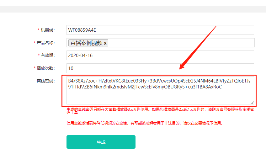 2.視頻加密后,想要限制賬號播放設備數(shù)量,就需要在后臺設置,用戶首次播放時綁定,需要一個激活碼,這個也是在視頻加密規(guī)則系統(tǒng)生成的。可以在視頻加密系統(tǒng)后臺進行控制。這些是我們所說的一機一碼。
